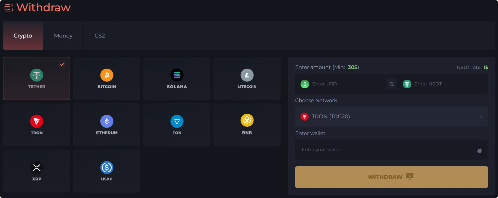 The platform is designed to provide a smooth withdrawal experience, giving players flexibility to choose between skins, crypto or fiat options.