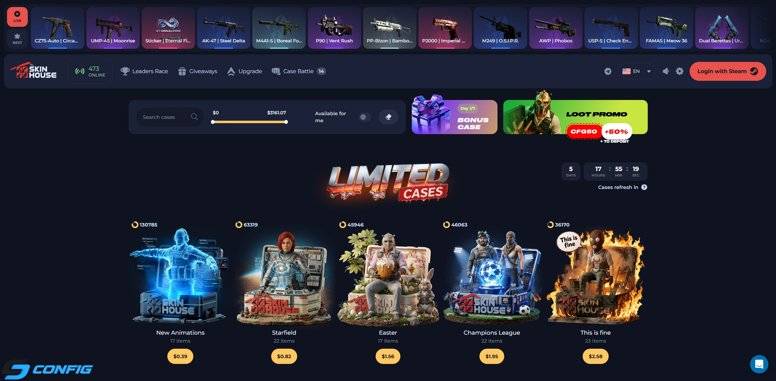 SkinHouse promo codes such as CFG50 and CFG55 help users maximize their balance and get more chances to win valuable skins.