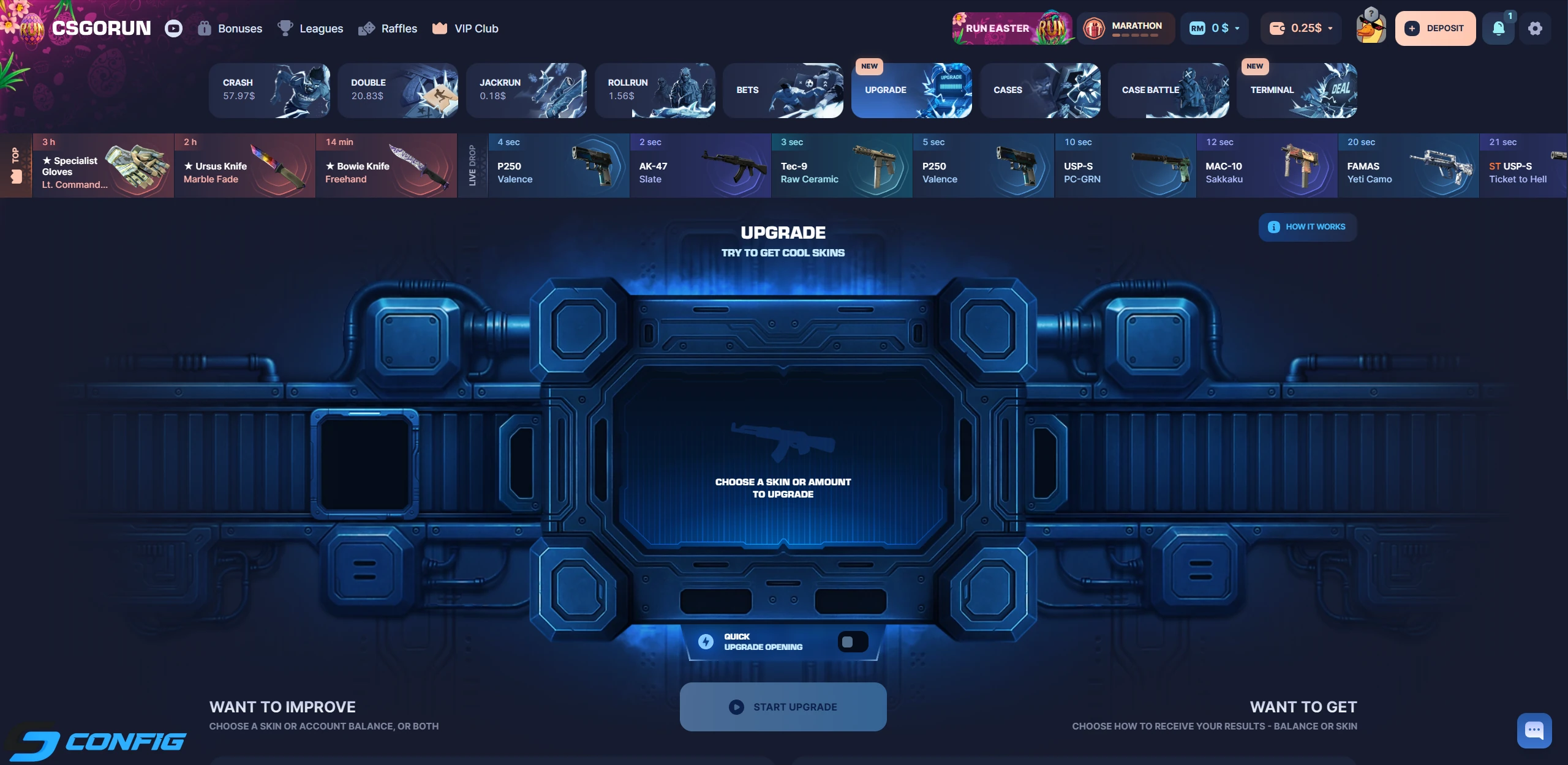 Upgrade allows players to risk their skins in exchange for a chance to receive higher-value items. It is one of the most popular features for experienced users.