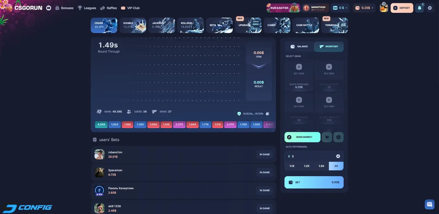 CSGORUN supports deposits and withdrawals using skins and other available payment methods. Users can withdraw their winnings through Steam trades or alternative systems depending on the platform.