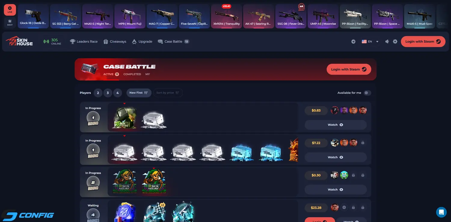 SkinHouse case battles add a competitive element to the standard case opening experience. In this mode, users can compete against other players by opening the same cases at the same time, where the winner takes all items from the battle.